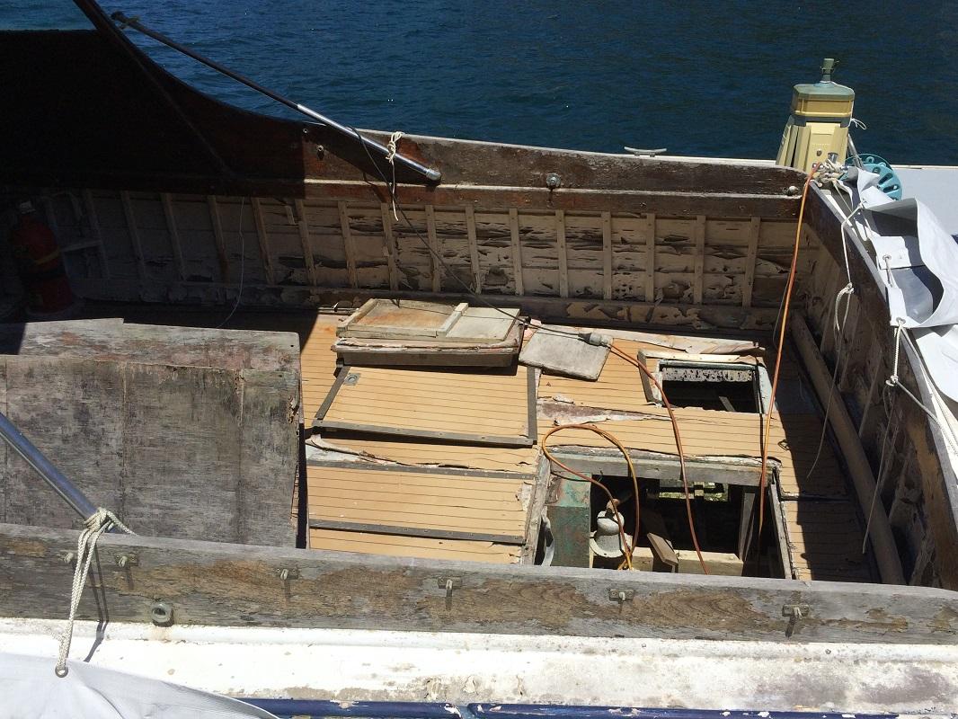 The unfortunate thing is that this Halvorsen has suffered from a substantial amount of rot in the decks / roofing. The top roof has recently been removed, to be completely replaced. The front deck roof appears to be fine, however, all of the decks themselves will need to be replaced, before we start to work on the hull. The boat has a clinker hull, and only the planks above the waterline appear to be damaged. The planks are plywood, and have started peeling / separating, and therefore most will need replacement.