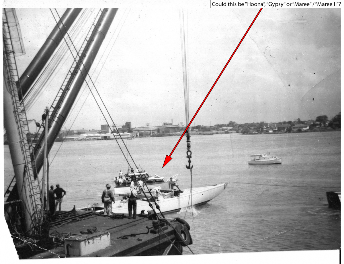 Update 2016: We found an article in tradeaboat.com.au with another sister boat "Maree II". See the last image attached with the article - It has virtually an identical hull and superstructure (other than the front round port holes). Interestingly, it mentions Maree II's sister boat, "Gypsy", but there is no mention of "Hoona". According to the article, the boats were utilised for offshore fishing competitions.