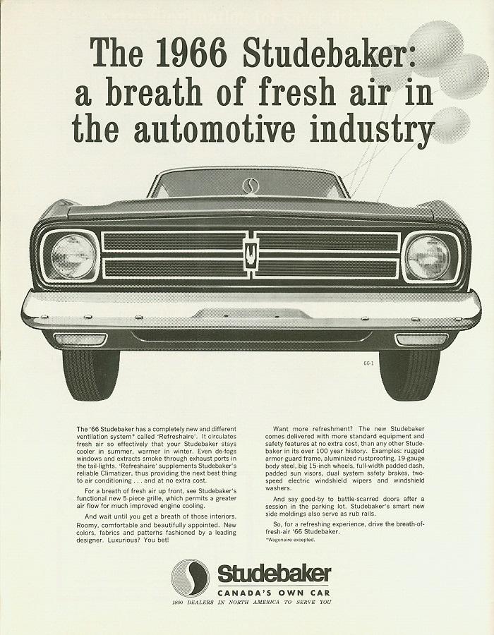 The financial difficulties and rumours surrounding Studebaker’s circumstances forced Studebaker to release details of the 1966 model in May of 1965, occurring earlier than planned in an attempt to reassure the public of the company’s confidence. The 1966 model line-up is believed to have sold from late September 1965. The line-up (including the Daytona Sports Sedan) was a revision of the 1964-1965 model design, and received a styling makeover in many subtle but significant ways by the well regarded independent design firm Marcks, Hazelquist and Powers. This independent firm was selected for the 1966 design project because Studebaker phased out its own internal design teams, with revisions successfully achieved on what was an extremely tight budget. In addition to the external design changes, 1966 saw the introduction of six new metallic paint colours, upgraded interior trim options, and several additional ‘safety’ features such as padded sun-visors and anti-glare wiper arms.