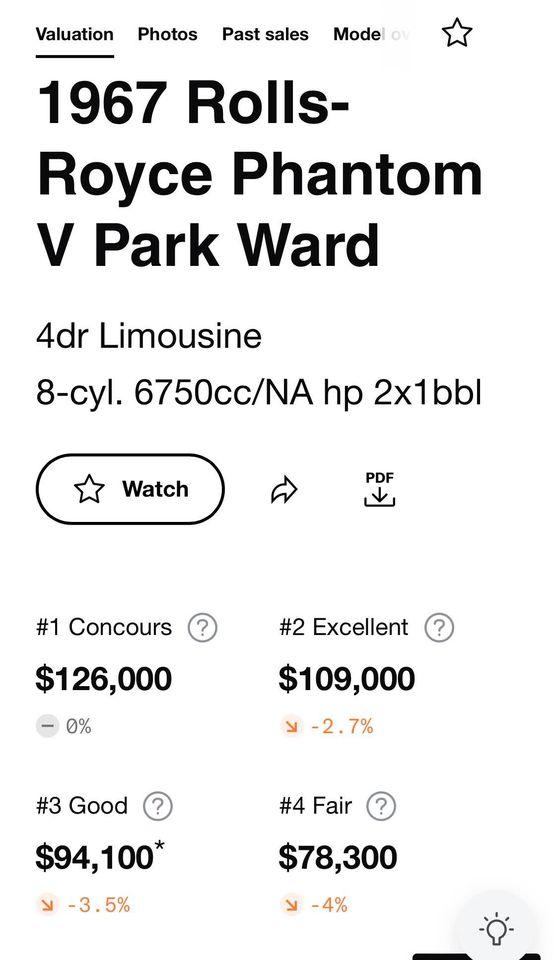 1967 Rolls Royce Phantom V Park Ward, spotted on FB Marketplace in July 2024, asking $90,000 USD. The car looks in great condition overall. and according to the seller was offered from a large collection and owned since 1992. This example was fully restored by Jeff Huber, and converted to fuel Injection, and the brake system has been fully upgraded. The first Phantom V on our register!!.