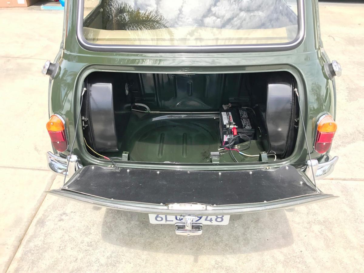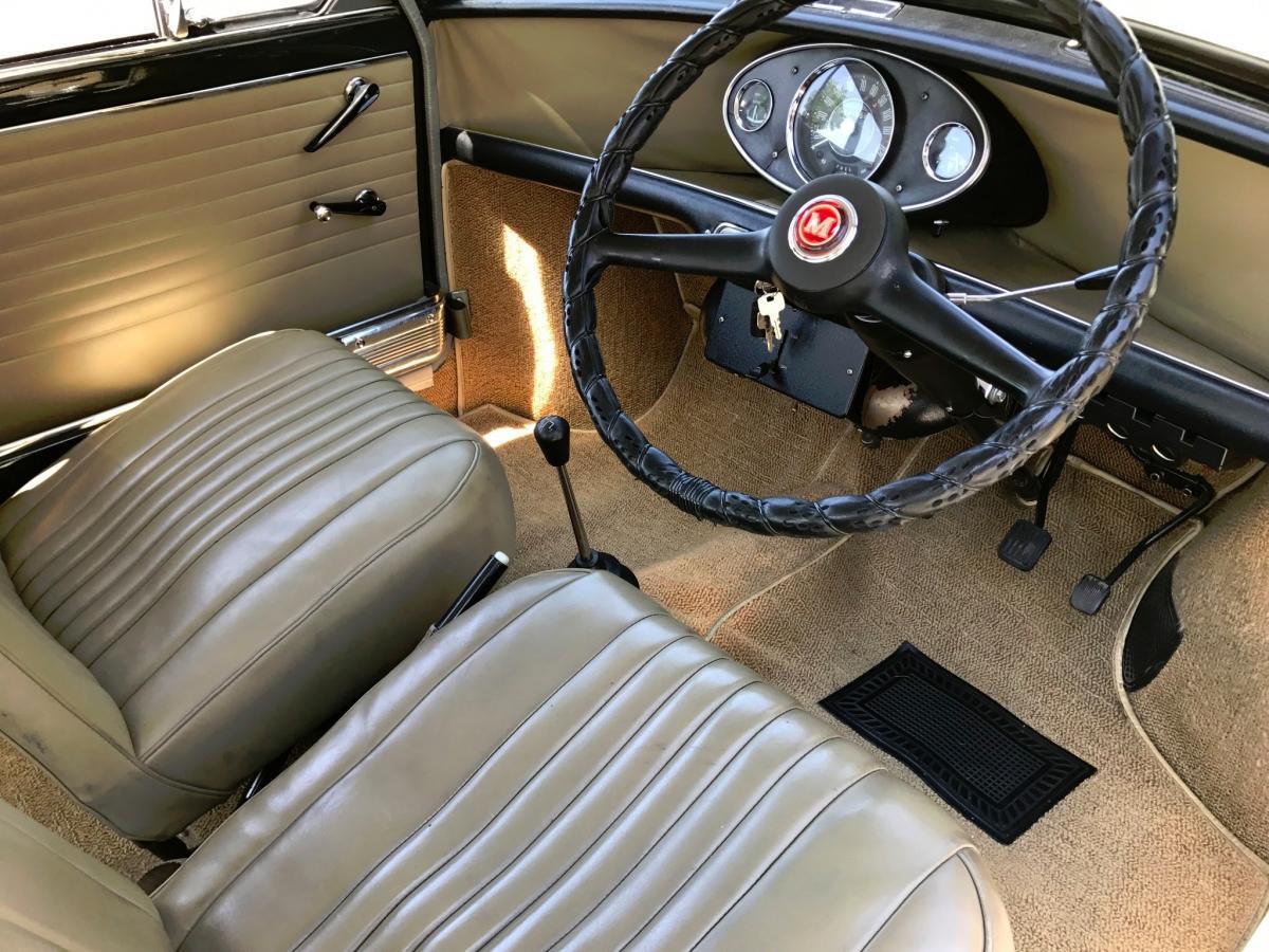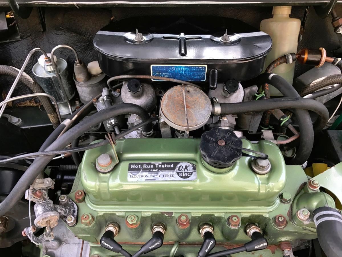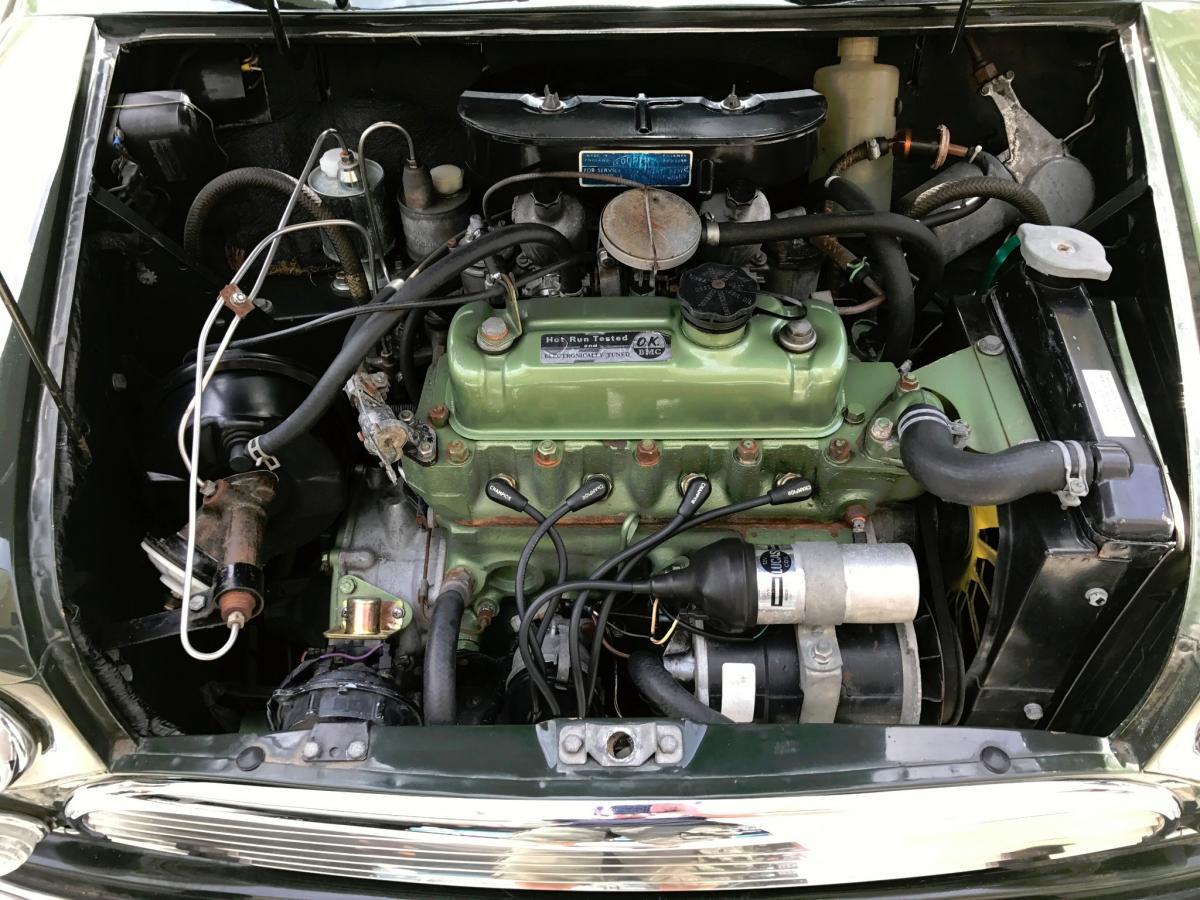 The 1275 BMC inline-four breathes through dual-SU carburetors and features a front mounted oil-cooler. The engine was rebuilt to original specifications six years ago due to a whining idler-gear bearing. The original pistons, crankshaft, camshaft, connecting rods, cylinder head, and gearbox were reused. Replacement bearings, gaskets, and seals were sourced from Heritage Garage in Costa Mesa, California.