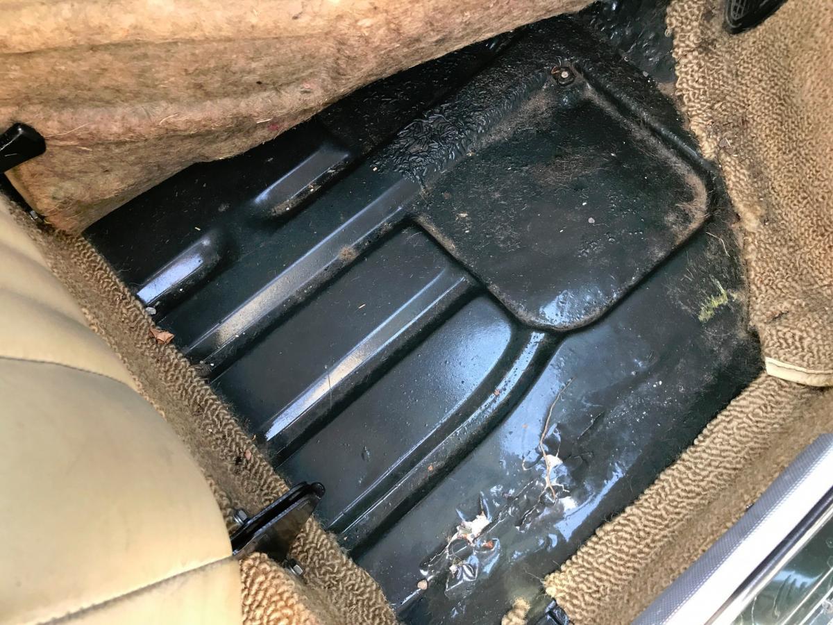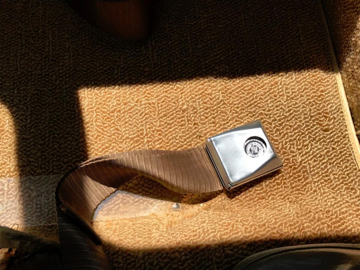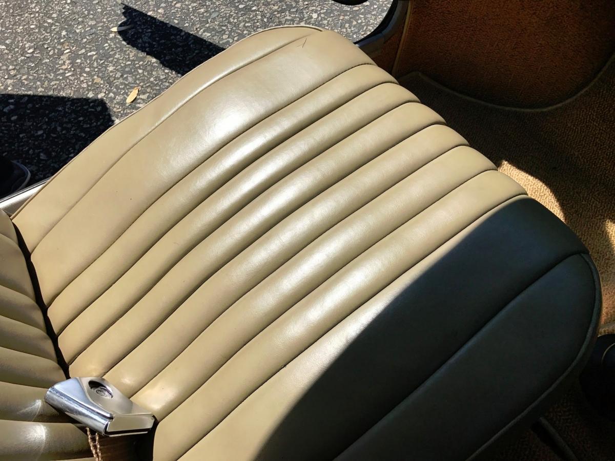 An S-specific 120 mph speedometer remains installed, and cracks are present on the gauge pod near the mounting screw holes and below the temperature gauge. A few small tears are shown in the beige vinyl seating. Some interior items have been replaced since the car was imported, including the carpeting. The speedometer flutters on deceleration, though all of the electrics are reported to function properly, including the wipers and blower motor.