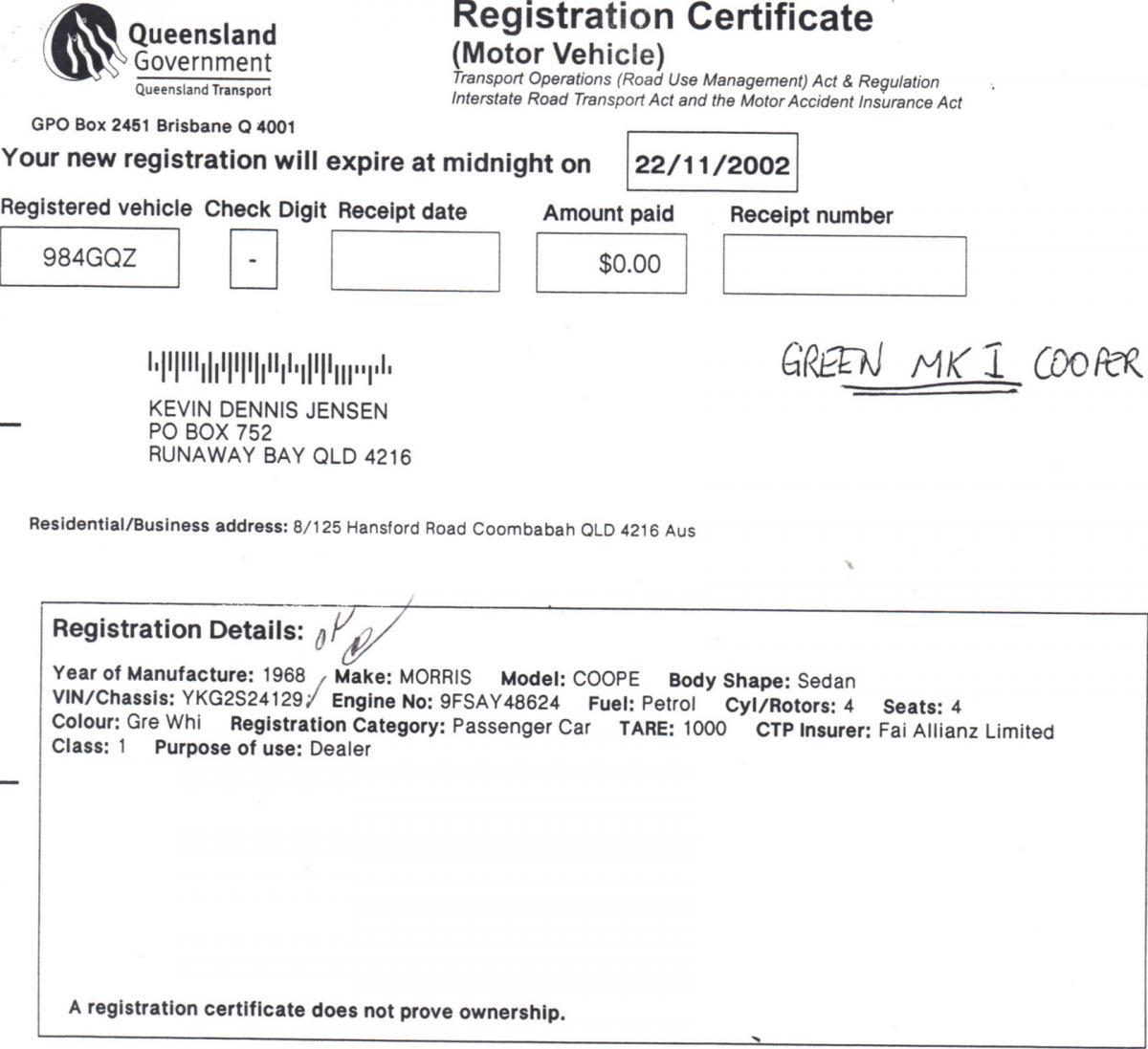 "This 1968 Morris Mini Cooper S is an Australian-built example that retains its original 1275 inline-four and 4-speed manual gearbox. The car was reportedly sold new to Ray Gulson, a car dealer and racer based in Canberra, Australia. It was imported from Queensland to Southern California in 2002 by The MiniGuy and has had three subsequent owners since. The seller acquired this RHD car six years ago and has driven it approximately 1,000 miles since. Finished in Lake Green with a Snow White roof, the car has been fitted with Minilite wheels and fender flares. An engine-out service was performed in 2011, while more recent maintenance included an oil change performed six months ago. This Mini is now being offered with a clean California title.
