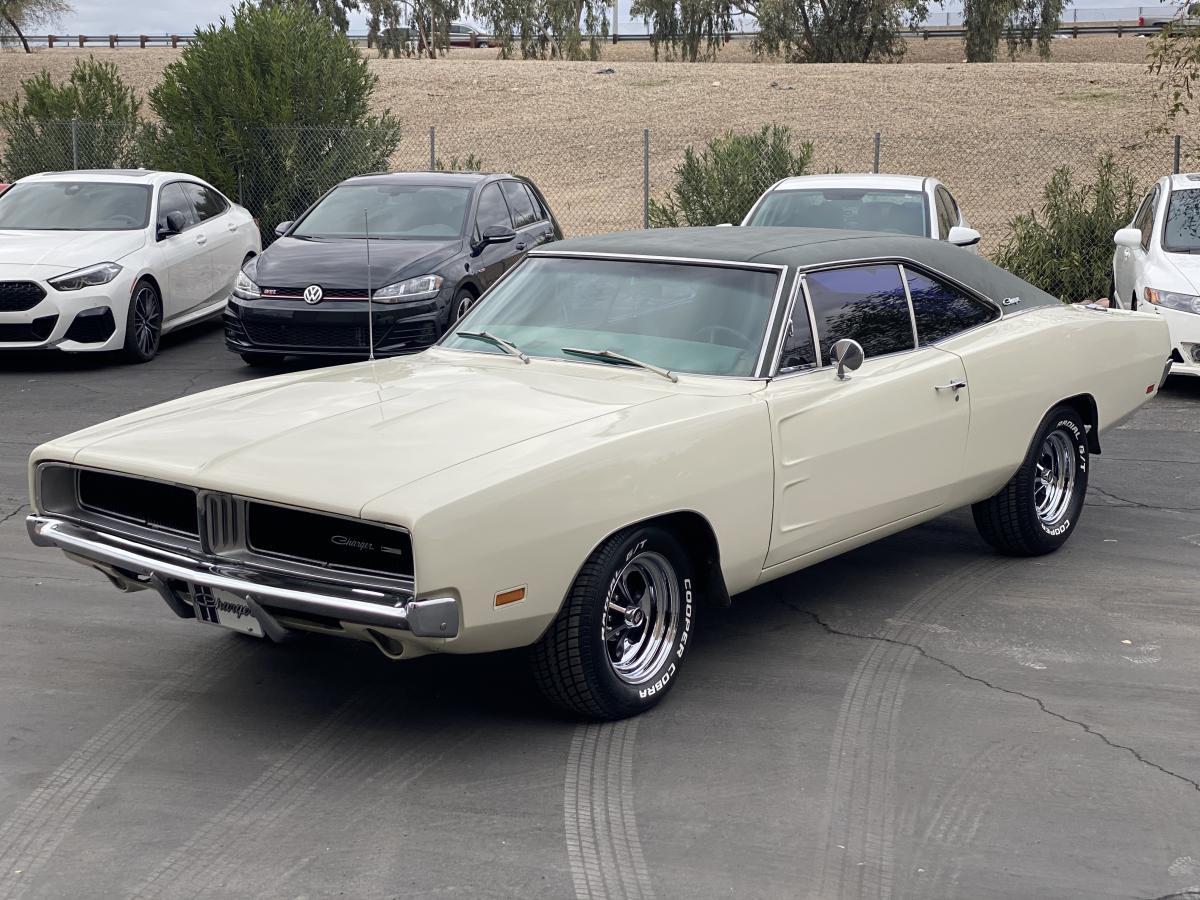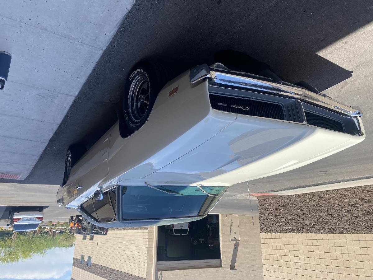 1969 Dodge Charger, white w/ dark green vinyl top and dark green interior. Car is a base model with 383-2bbl, 727 automatic column shift, numbers matching engine, transmission, and rear end. Came with factory installed air conditioning, power steering, and power brakes. Car is a native of Arizona, first registered in 1969.
