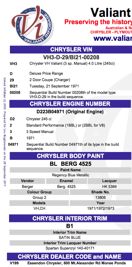 This matching numbers 3-speed manual was up for sale on Ebay Australia in October 2017. It is fitted with its original 245 hemi, with the driver noting it drives well. It has some rust under some of the paint and underside floor pans, but is all very repairable. It is also missing its carpets, and needs a new hood lining, and driver's window. The car was not registered at the time of sale.
