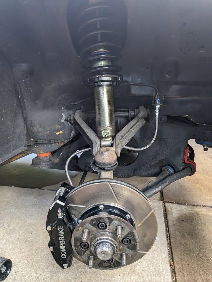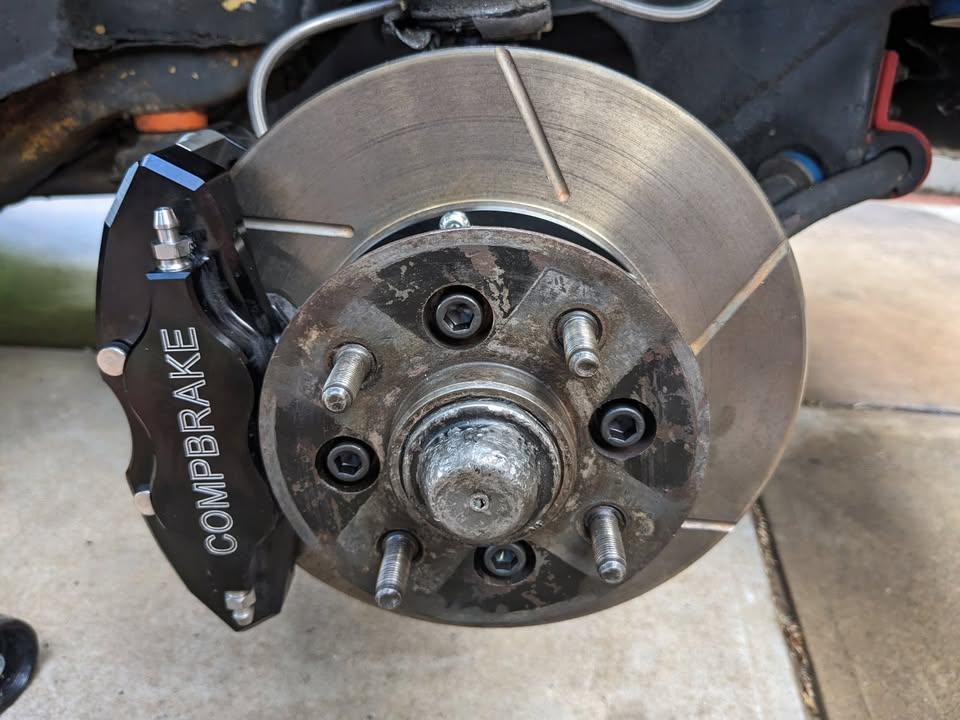 - Four-piston vented front brakes from Compbrake, UK. Rebuilt master cylinder. Reconditioned rear drums with new slave cylinders and linings.