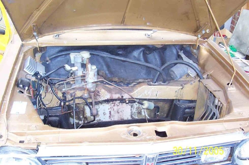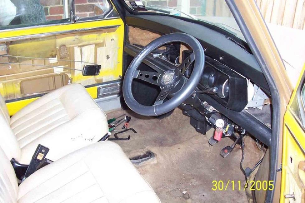 Other than the missing engine, this car appears to be fairly original. I note however that although this car has the correct type of seats, I assume that they have been re trimmed in full beige, as the Gold 1275 LS should have come with brown velour trim. The steering wheel is also different to the formula GT wheel which should normally be on an LS. Another additional feature not always on the 1275 LS model, are the foglights mounted in the grille. This was a feature which came on all 998cc LS models, however, was an option on the 1275 LS. This feature could therefore possibly be factory, or an aftermarket change. Further, it appears that someone has installed wood and picket flares, rather than replacing the original factory clubman flares on the guards. The car also has a sunroof, of a type commonly fitte dto minis in the 70's, which could possibly be a dealer accessory, or an aftermarket change.