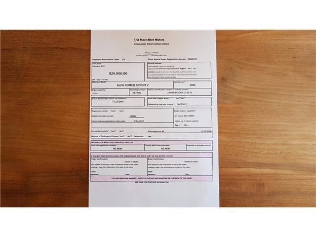 Alfa Romeo Sprint Z QV-(Quadrifoglio Verde) - a genuine QV with original 70,251km. Cam belt replaced at 68,447km. SOld new in NZ! Zender body kit fitted by Archibalds Christchurch when new. Has its original keys, service and manual book.