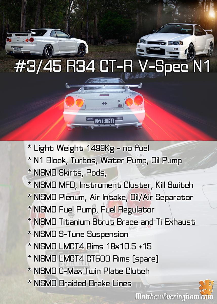 1 of 37 R34 GT-R V-Spec N1 - although Wiki purports that 45 were manufactured. This was the first N1 made after a preproduction run of 5. I'm very privileged to own this N1; a lightened up version of the BNR34 weighing in at below 1500Kg.